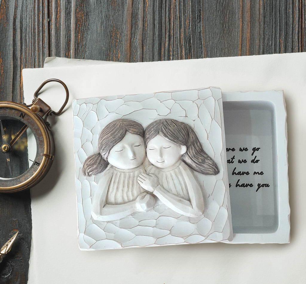 Celebrate the bond of friendship and sisterhood with this keepsake box. Crafted with care, this elegant 4.5x4.5x2.5 inch box is made from durable polyresin and adorned with intricate hand-painted details. It's more than just a box; it's a symbol of cherished memories, love, and the unbreakable connection between two people.