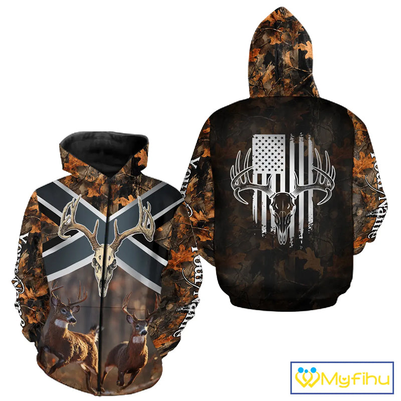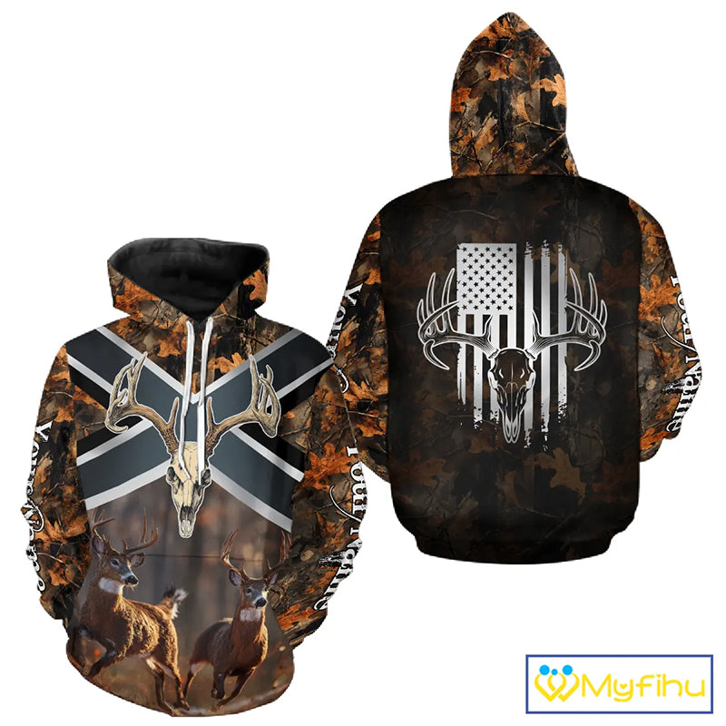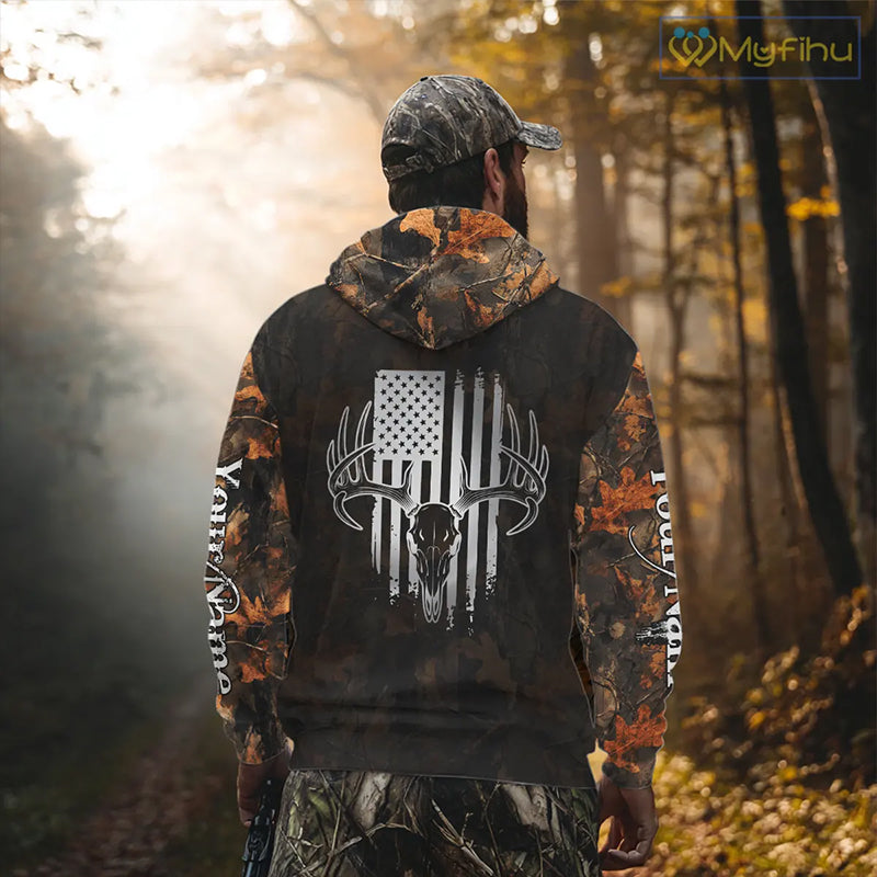 Hunting Shirt with Running Deer Design US Flag - Orange Camo Custom Name 3D Print NHT329