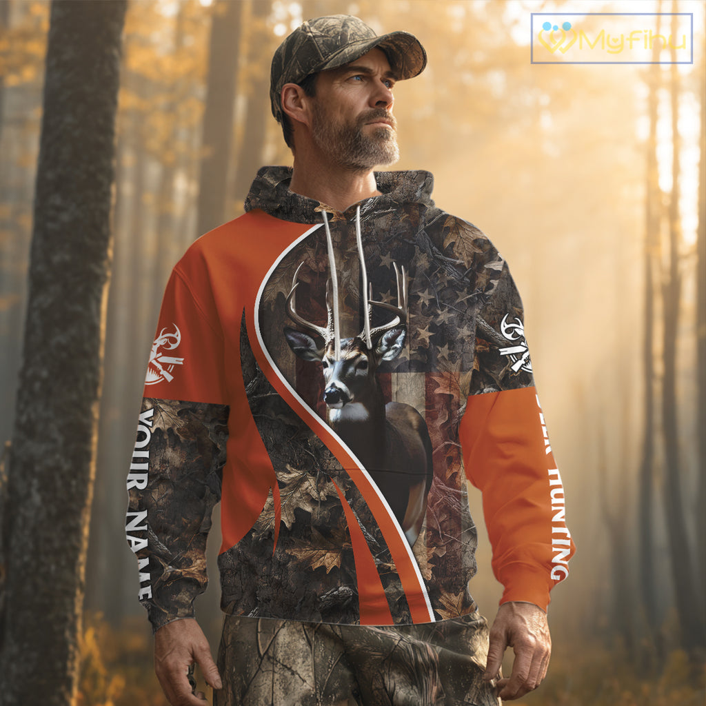 Custom Whitetail Deer Hunting Shirt 3D All Over Print with Orange Camo US Flag Hunting Gifts NBT253