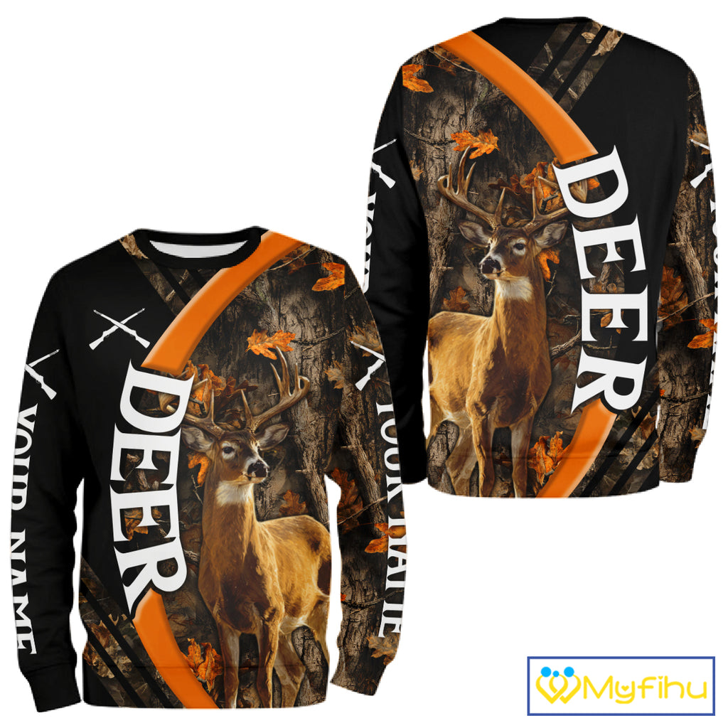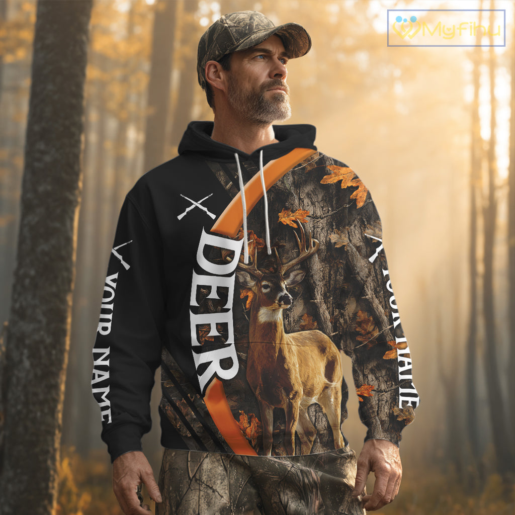 Whitetail Deer Hunting Shirt Custom Name Orange Autumn Leaves Camo, Season Hunting Hoodies For Men NBT307