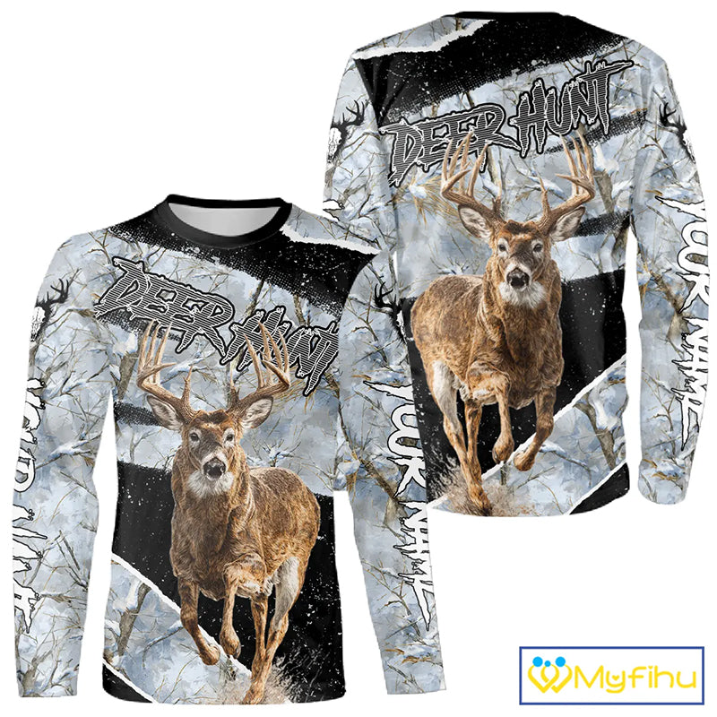 Winter Whitetail Deer Camo Customize Name 3D Printed Long Sleeve Hunting Shirts for Men, Hunting Gifts NBT260