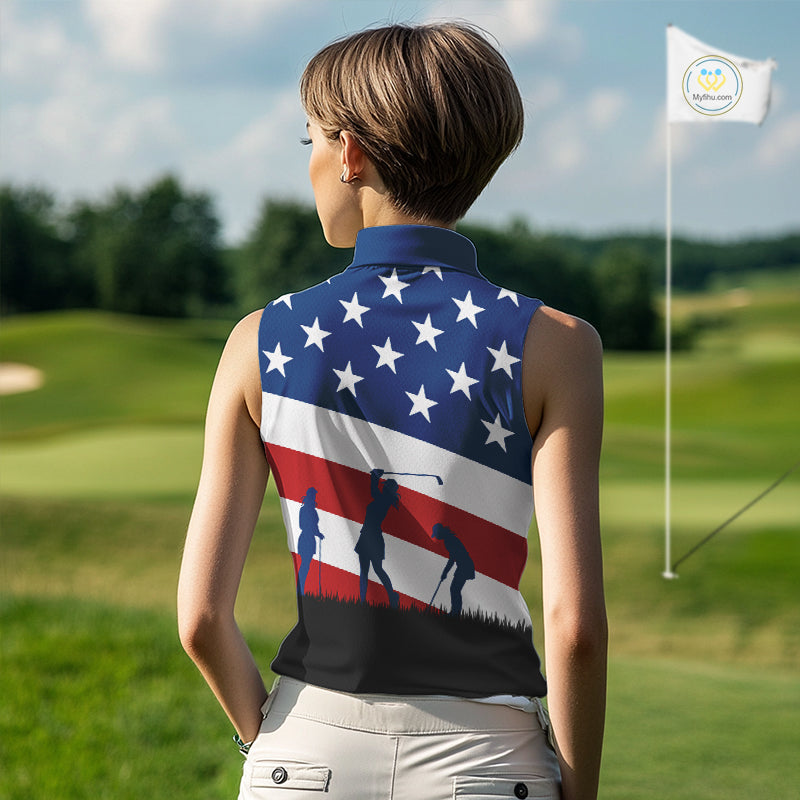 American Flag sleeveless golf polo shirt Custom Red, White and Blue Patriotic ladies golf attire NQS10230