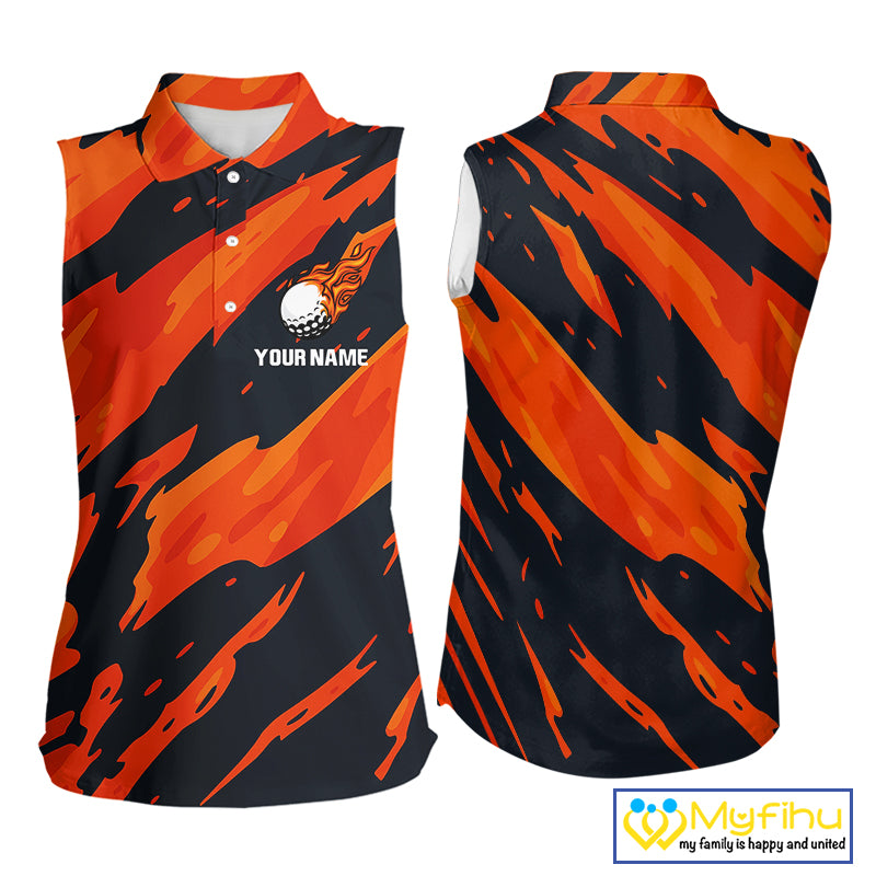 Black and Orange Flame Women Sleeveless Golf polo shirts Custom ladies golf outfit, golf gifts NQS10069