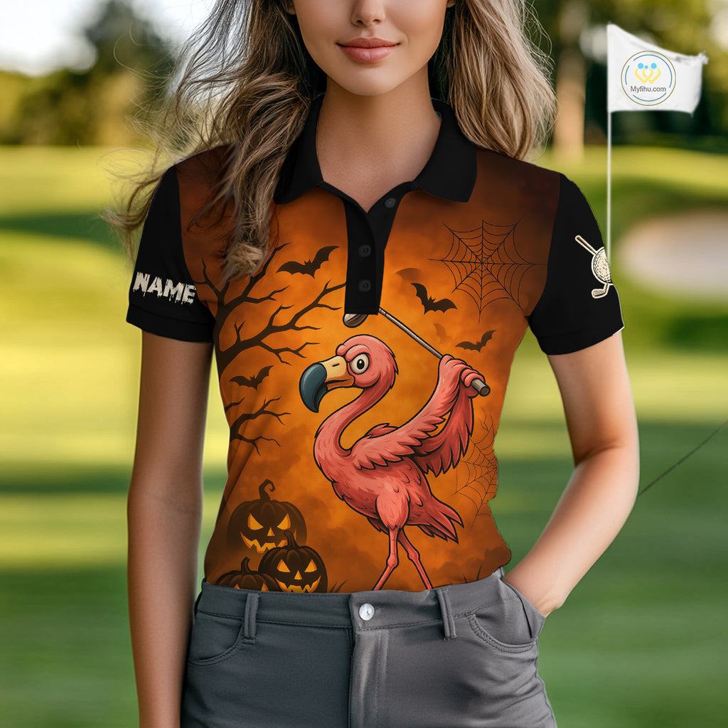 Black and Orange Funny Flamingo Golf Polo Shirt For Women Custom Halloween Golf Attire Golfing Gifts NQS10701