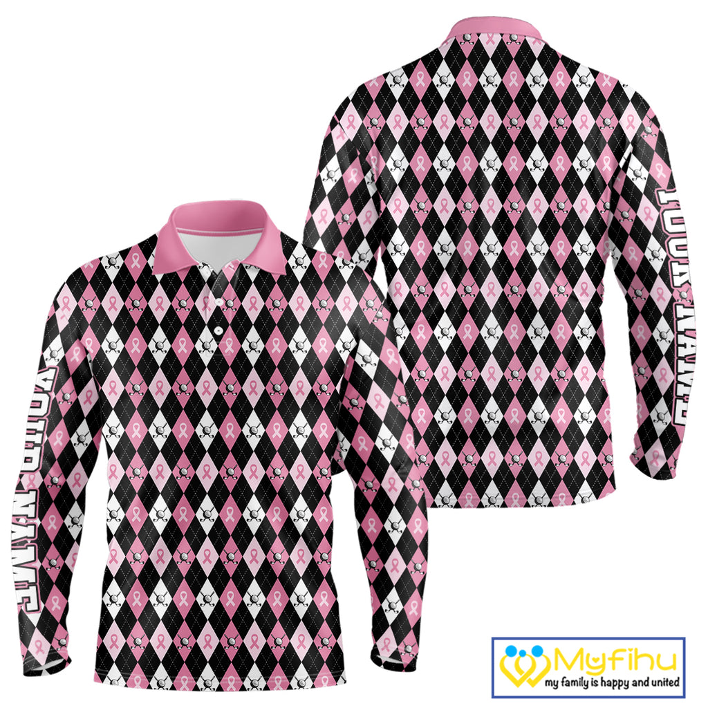 Black and Pink ribbons argyle pattern Mens golf polo shirt Custom Breast Cancer Awareness golf outfit NQS10513