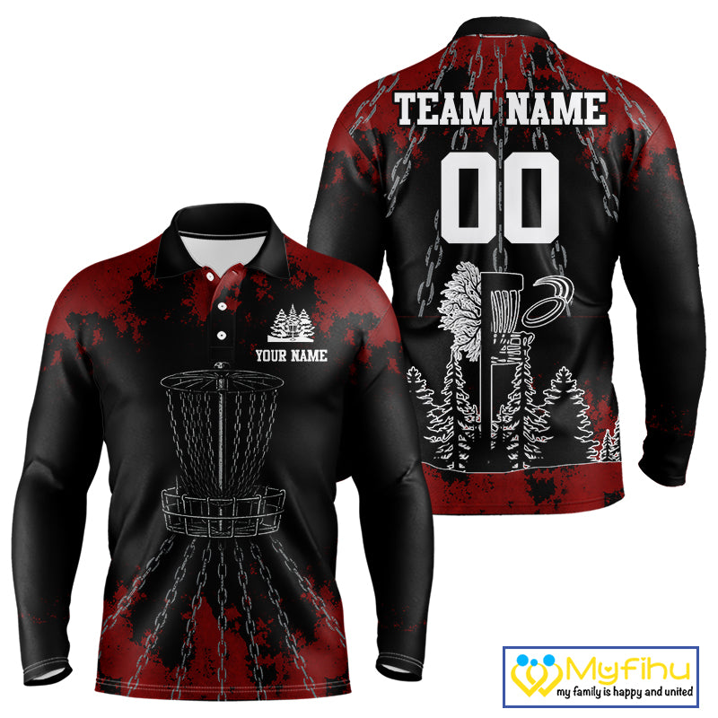 Black and Red Disc golf basket chain Men disc golf polo shirt custom number disc golf outfit for team NQS10438