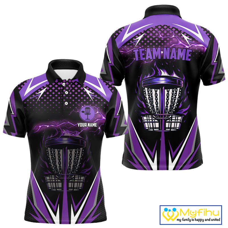 Black Mens disc golf polo shirts custom purple fire lightning team disc golf jersey, unique golf gift NQS10173