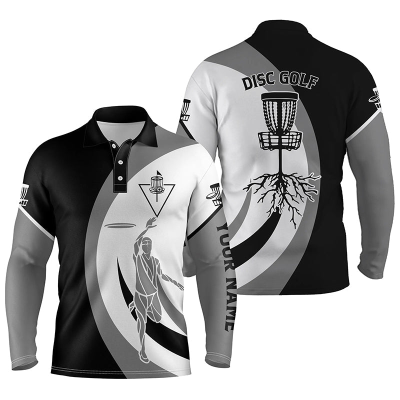 Black white Mens disc golf polo shirt custom name disc golf basket, personalized disc golf shirts NQS4604