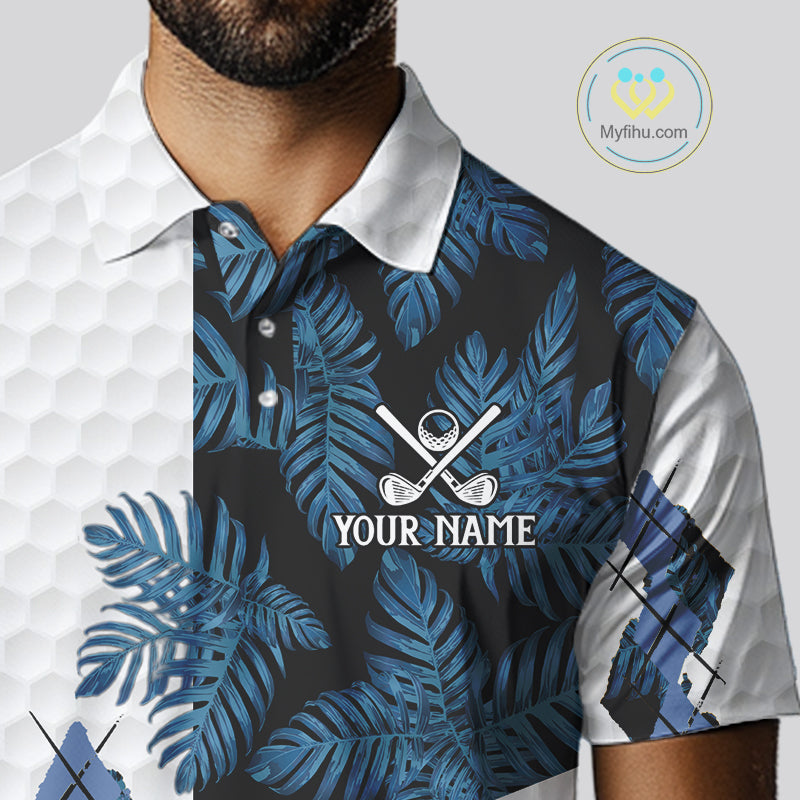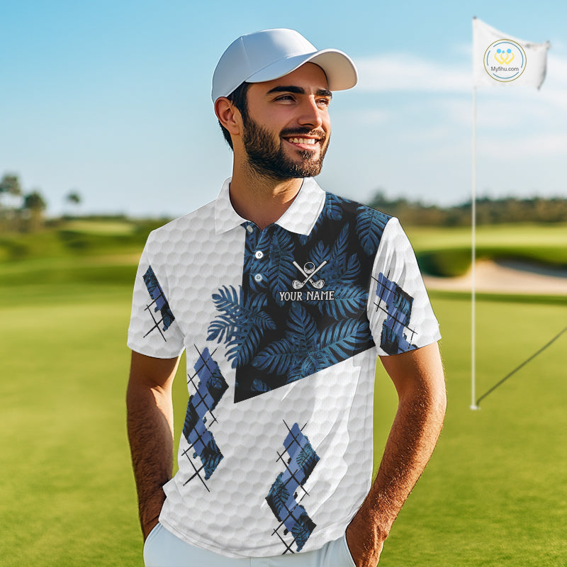 Blue tropical argyle pattern white golf polos shirts for men custom mens golf top, best golf gifts NQS10303