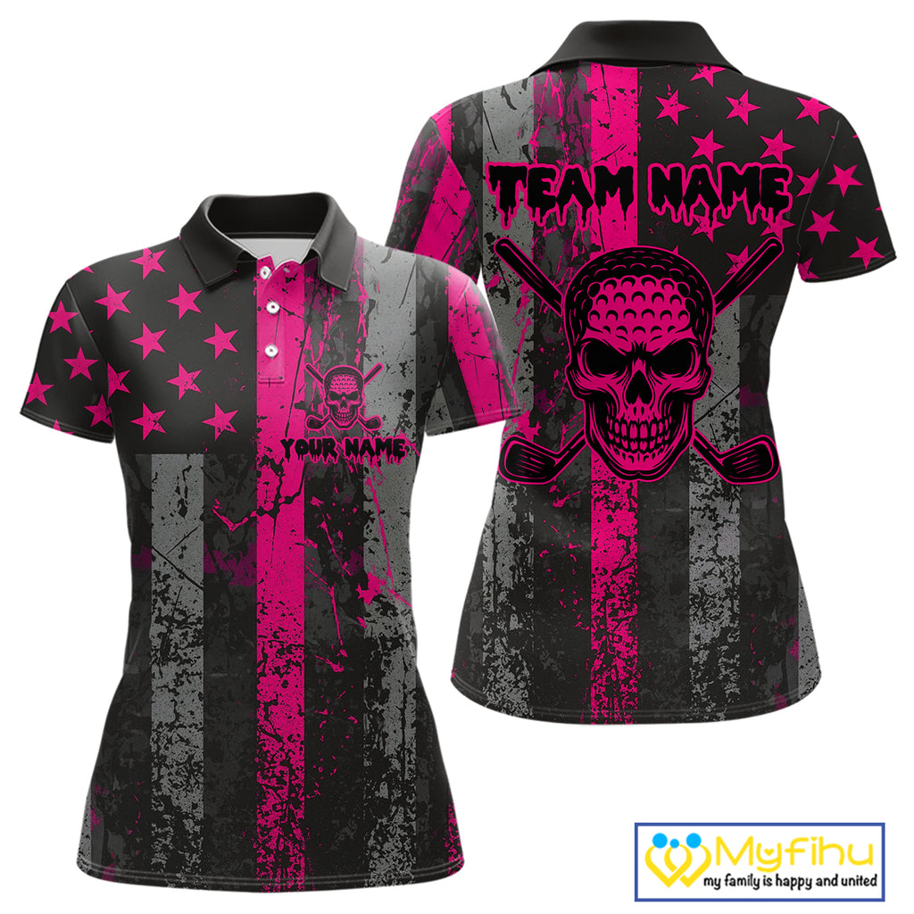 Custom Pink Grunge American Flag Patriotic Skull Golf Shirt For Women, Retro Ladies Golf top NQS10482