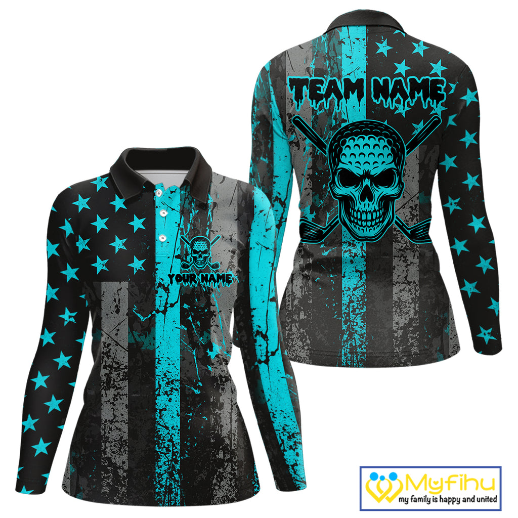 Custom Turquoise Grunge American Flag Patriotic Skull Golf Shirt For Women, Retro Ladies Golf top NQS10481