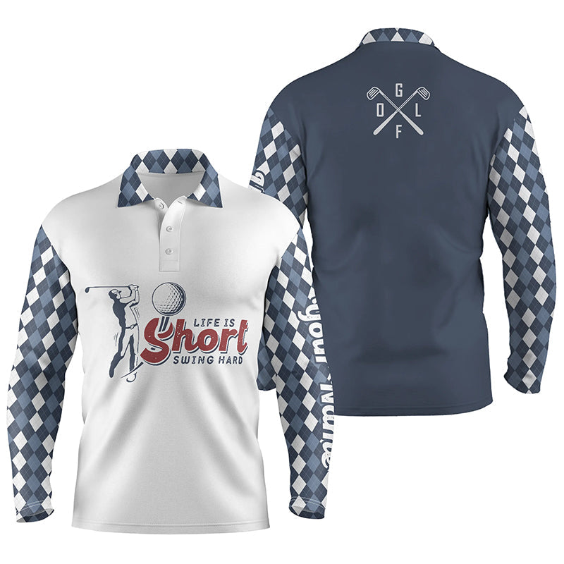 Funny Mens golf polo shirt custom life is short swing hard blue argyle pattern team golf polo shirts NQS5358
