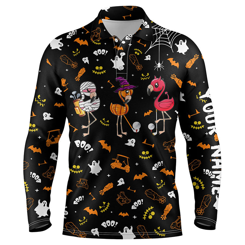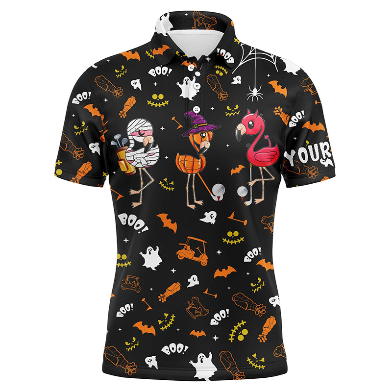 Funny Mens golf polo shirt orange black Halloween background custom name Flamingo golf friends NQS3974