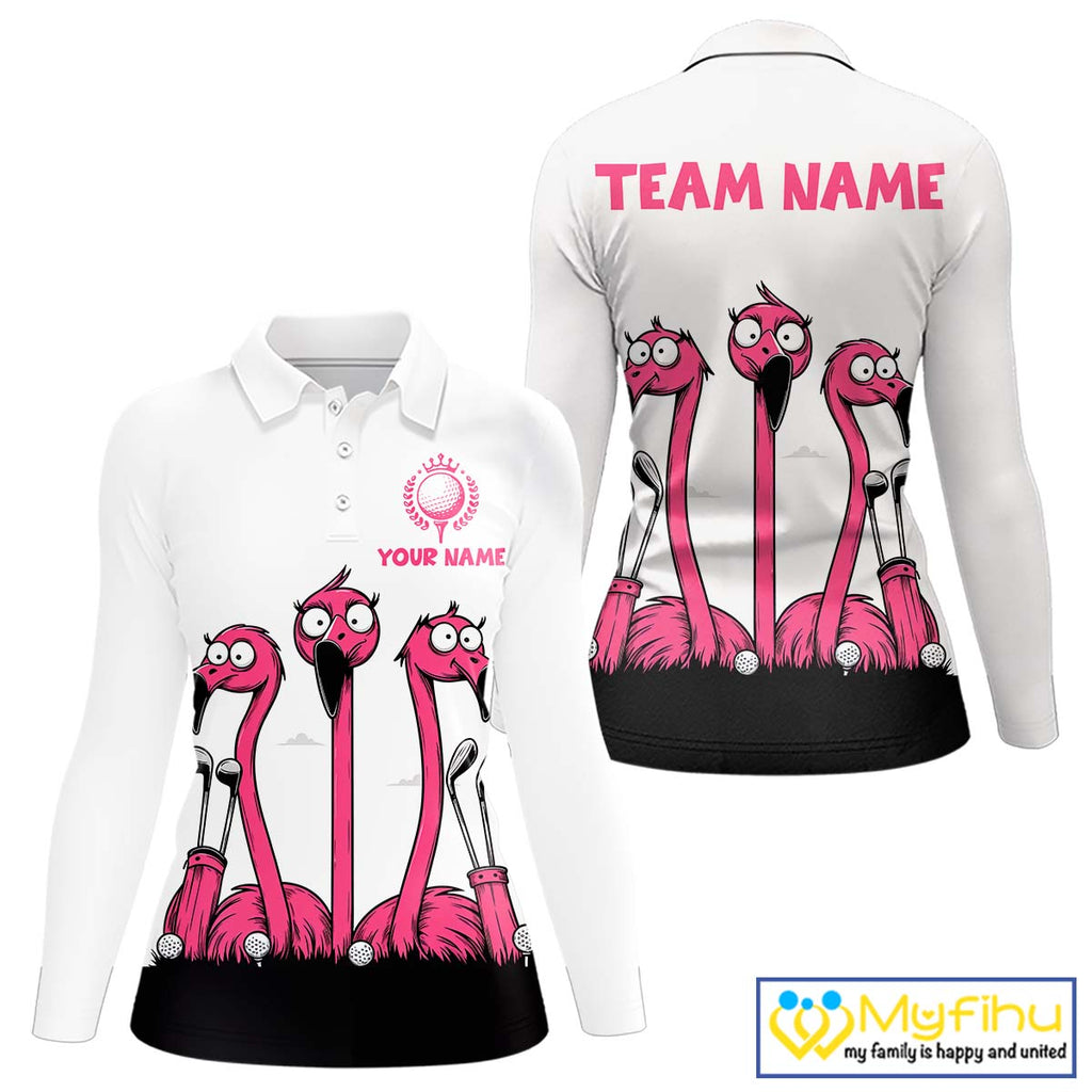 Funny pink flamingo friends white Women golf polo shirts Custom flamingo golf outfits for ladies NQS10201