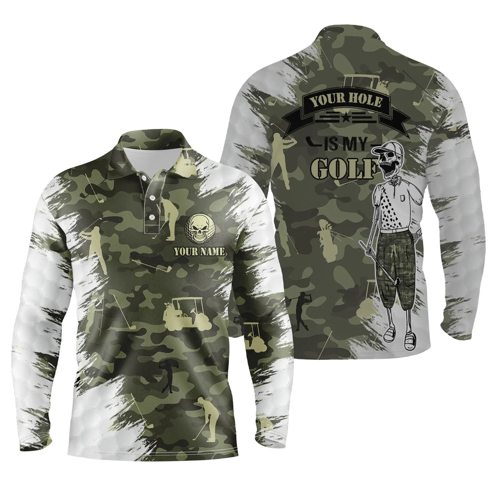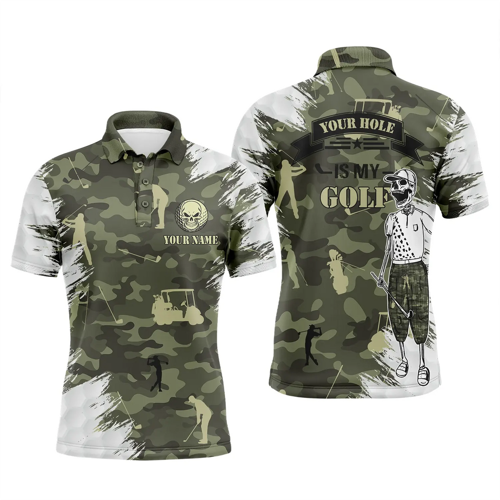 Funny skull green camo golf polo shirts for men custom name your hole is my goal mens polos shirt NQS4827