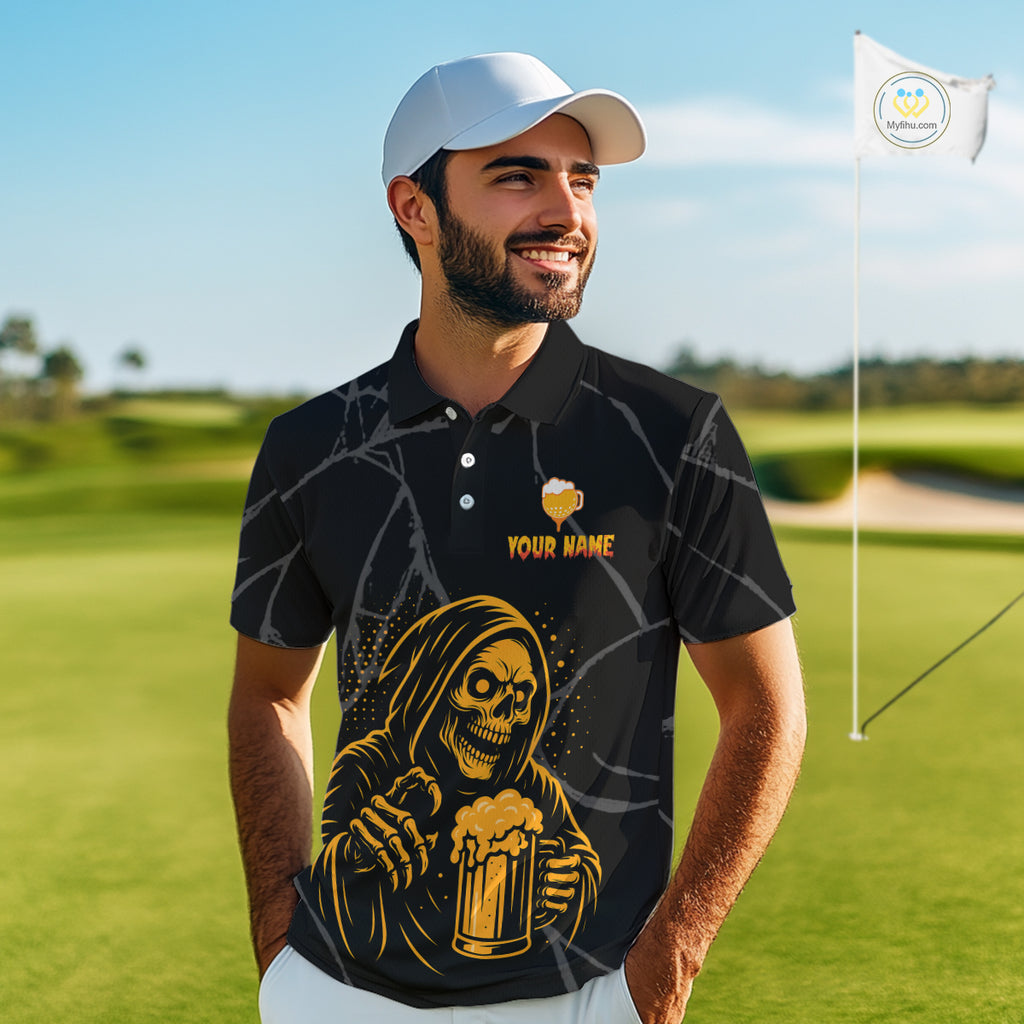 Golf and beer Mens golf polo shirt Custom black and gold skull mens golf attire Halloween golf outfit NQS10519