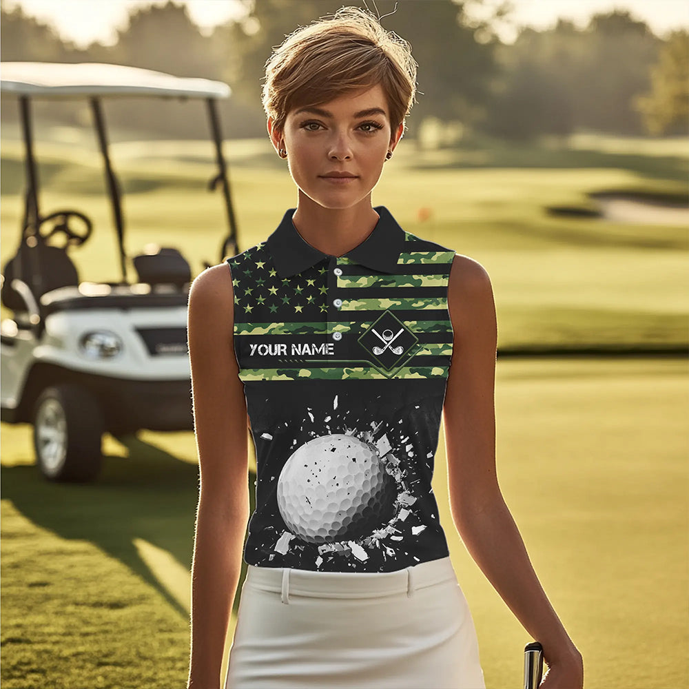 Green Camo American flag black Women sleeveless polo shirt custom patriotic team ladies golf apparel NQS9517