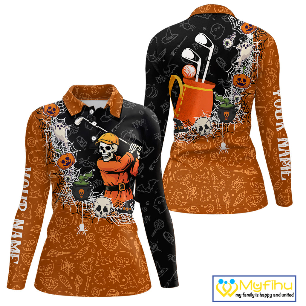 Halloween Skull Playing Golf Women Golf Polo Shirt Custom black & orange Halloween mens golf outfit NQS10341