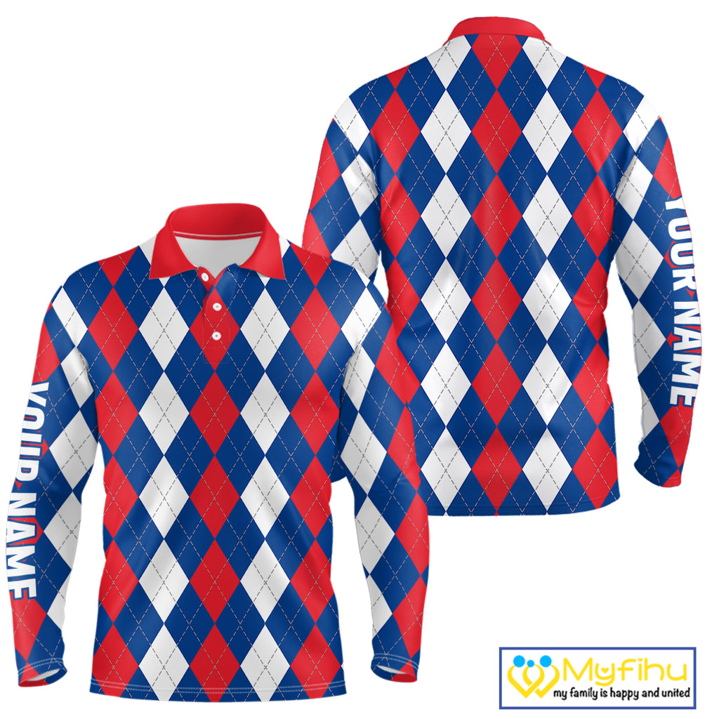 Mens golf polo shirt custom red, white and blue argyle plaid pattern golf attire for men NQS9847