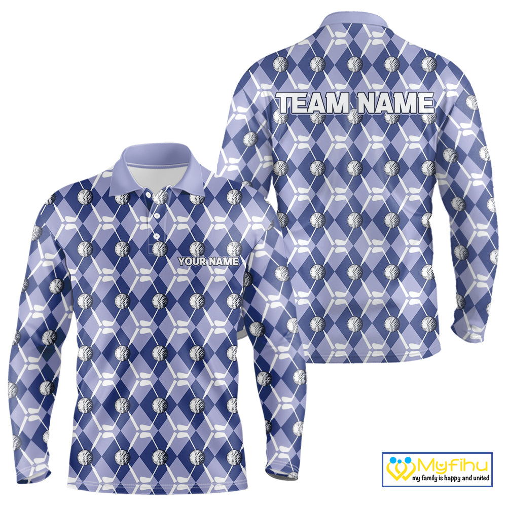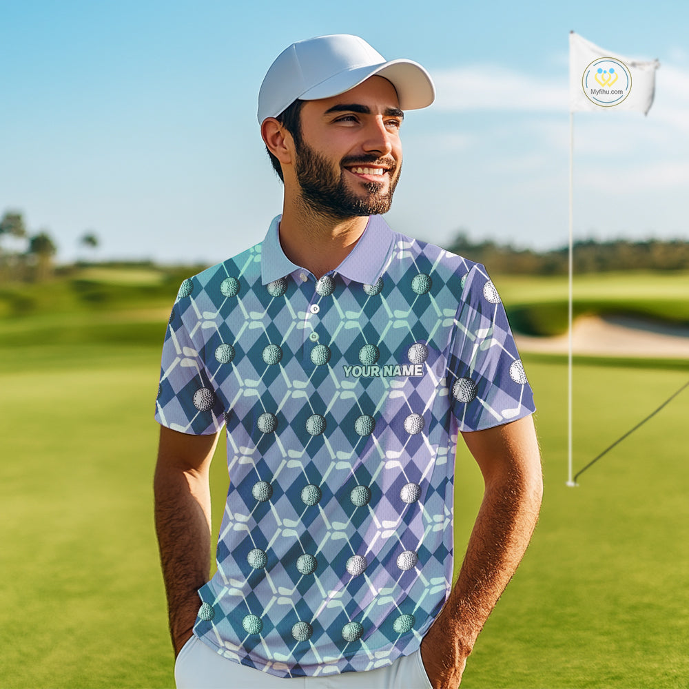 Mens golf polo shirts custom blue argyle plaid pattern golf attire for men, golfer gifts NQS10434
