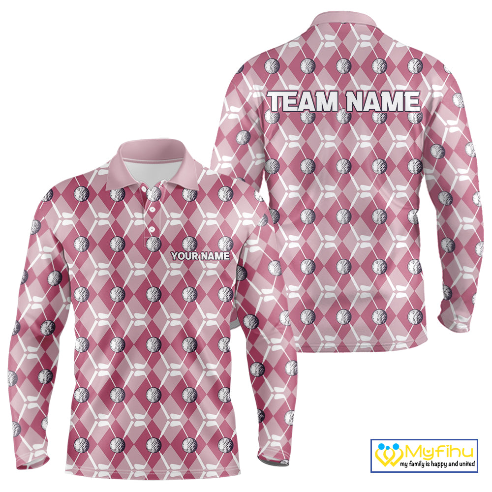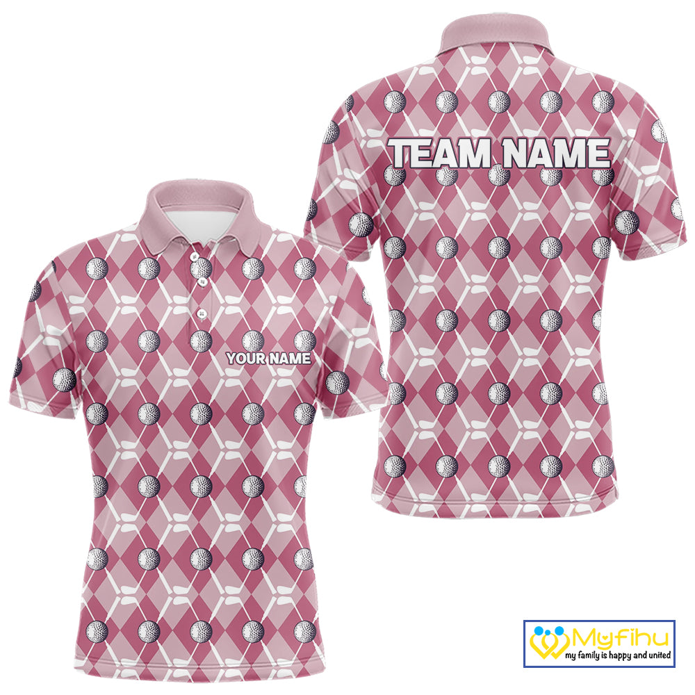 Mens golf polo shirts custom pink argyle plaid pattern golf attire for men, golfer gifts NQS10443