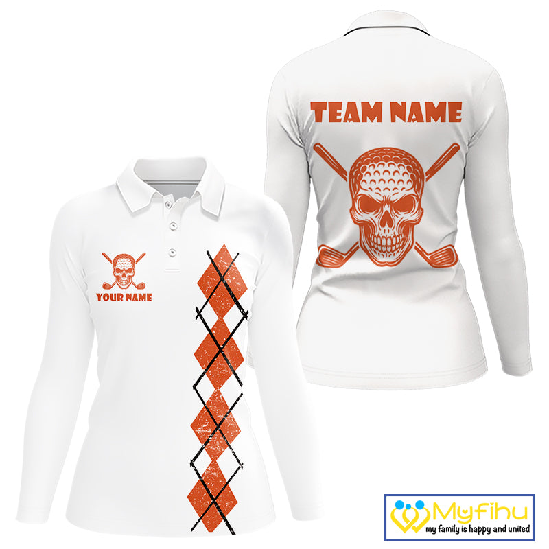 Orange argyle plaid pattern Skull White Golf polo shirt for Women custom Halloween ladies golf attire NQS10357