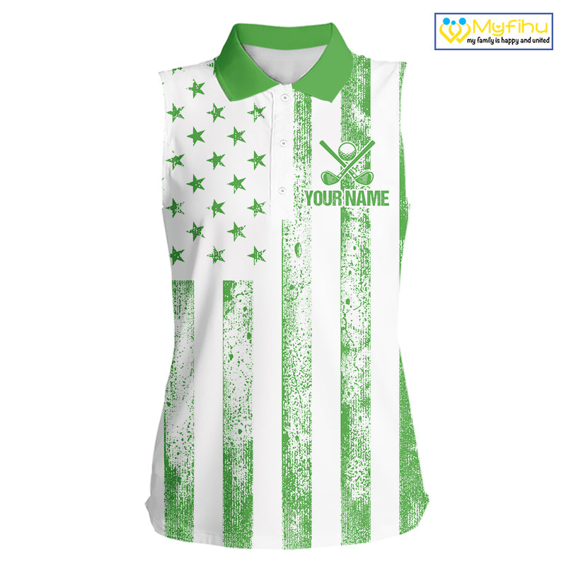 Personalized Green & White American Flag Retro Women sleeveless polo shirt Patriotic laies golf top NQS10309
