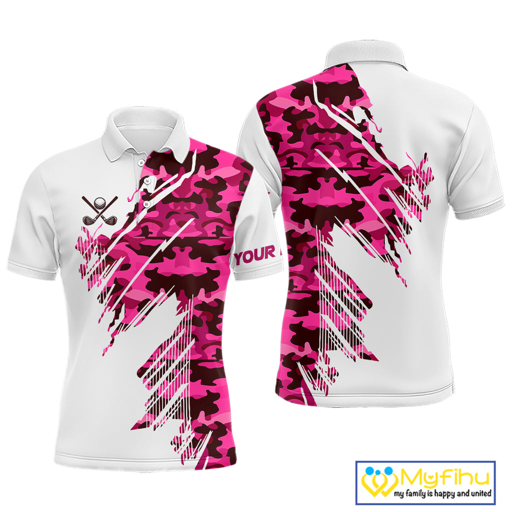 Personalized Mens golf polo shirts custom white and pink camo mens golf apparel, golfing gifts NQS10335