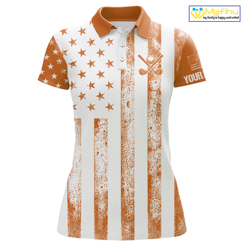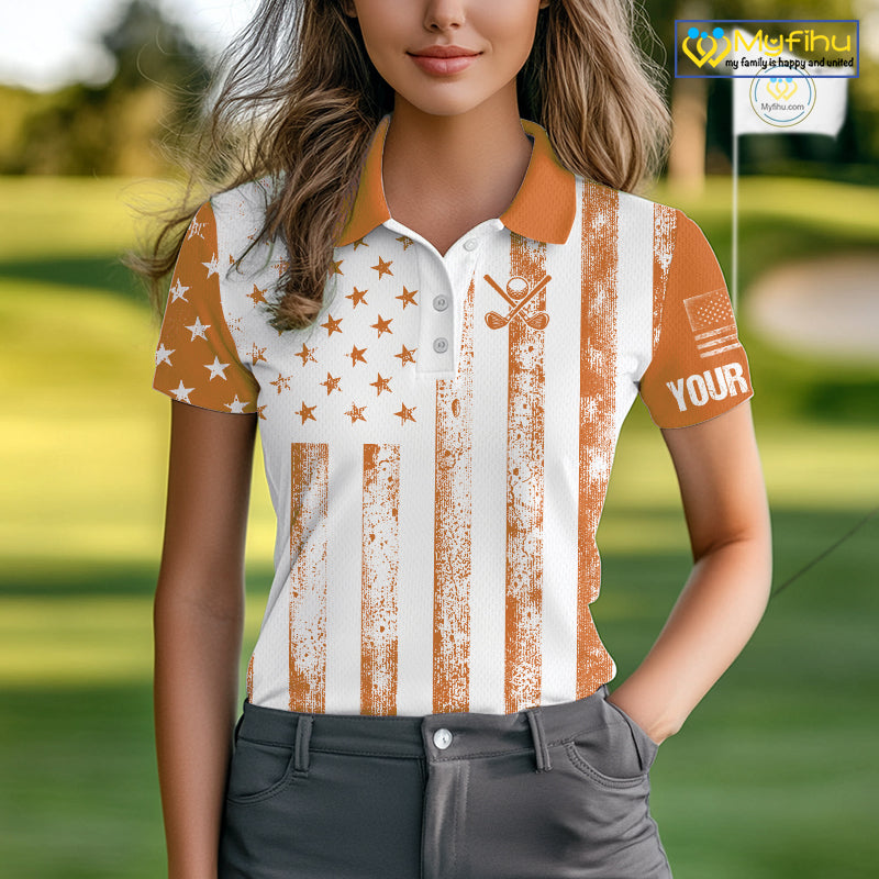 Personalized Orange White American Flag Retro Women golf polo shirt Custom Patriotic ladies golf top NQS10310