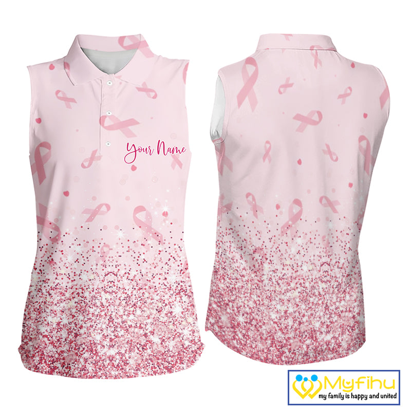 Pink glitter ribbons pattern Sleeveless polo shirt Custom Breast Cancer Awareness ladies golf outfit NQS10514