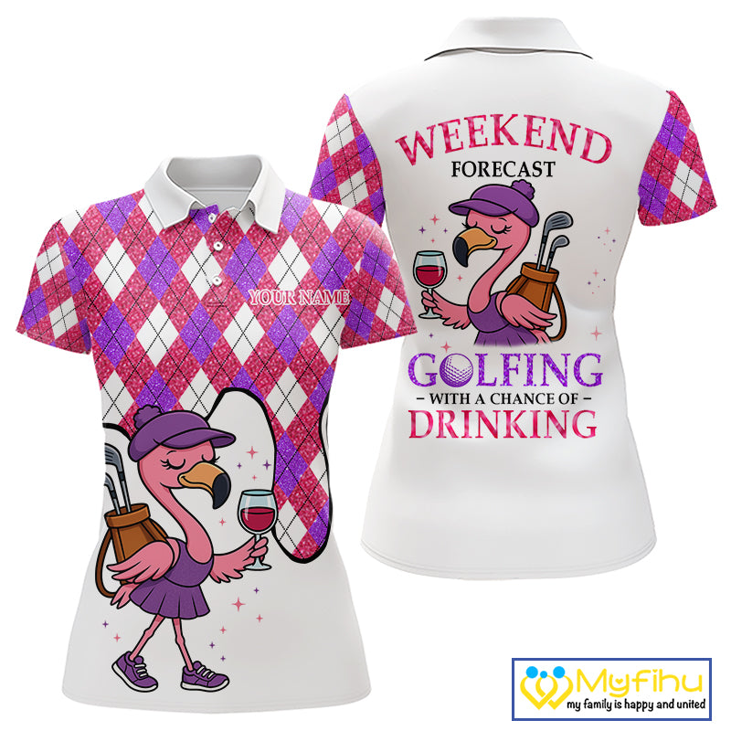 Pink purple glitter argyle pattern Flamingo Women golf polo shirt Custom weekend forecast golf & wine NQS10325