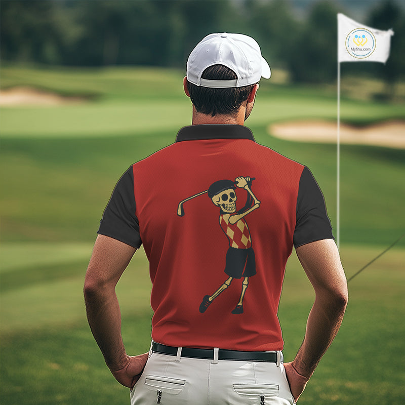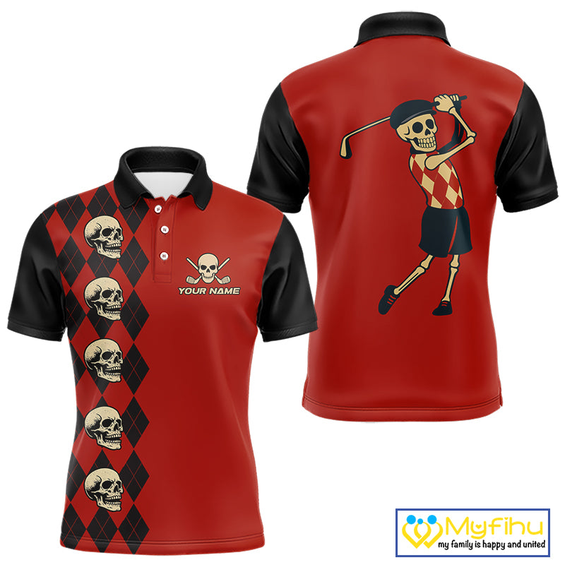 Red and Black argyle pattern Skull Golf Polo Shirts for men Custom mens golf outfit, funny golf gifts NQS10250