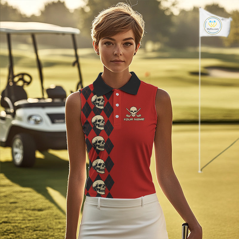 Red and Black argyle pattern Skull Women Sleeveless Polo Shirt Custom funny ladies golf outfit NQS10250