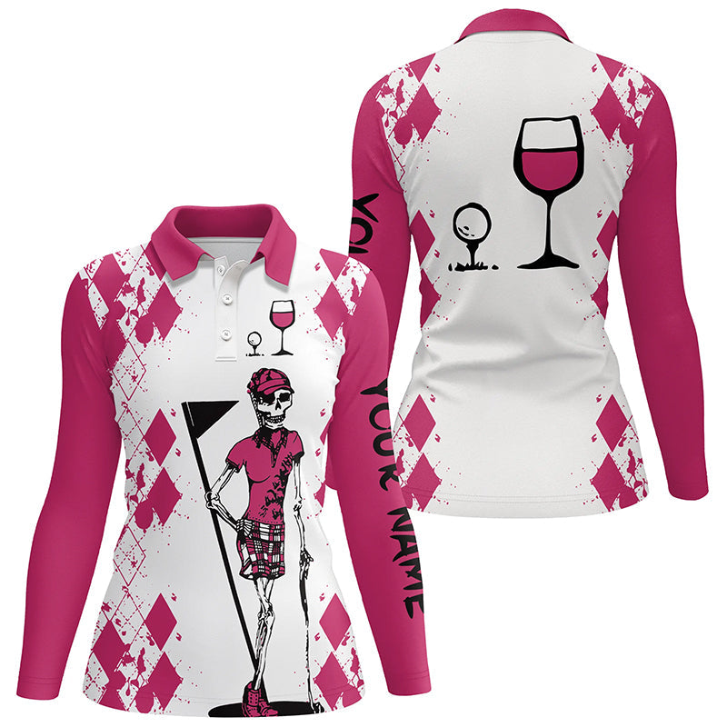 White Pink womens golf shirt skull Golf & wine custom name womens golf polo shirt NQS3451