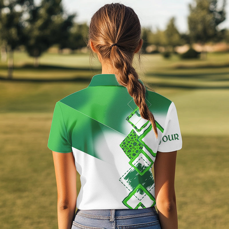 Women golf polo shirt custom name white and green shamrock St Patrick day golf shirts, golfing gifts NQS9676