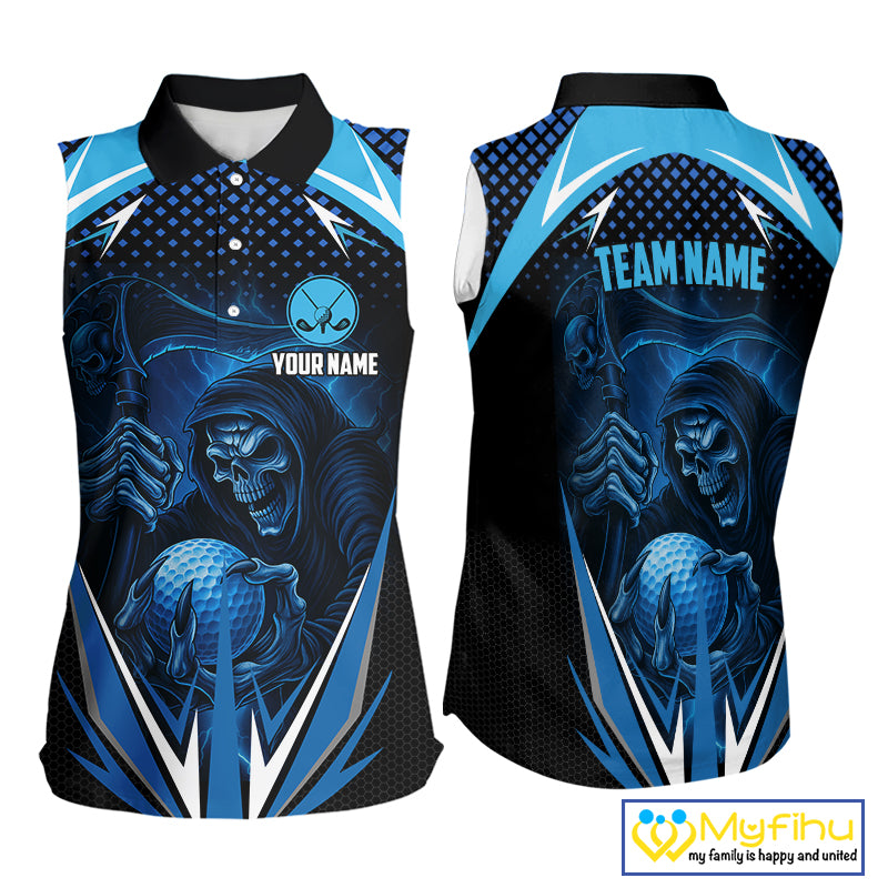 Women sleeveless golf polo shirt custom Blue Lightning reaper skull Golf team jersey golf attire NQS10206