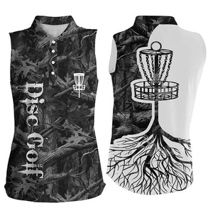 Womens disc golf sleeveless polo shirt gray camo disc golf basket, personalized disc golf shirts NQS5035