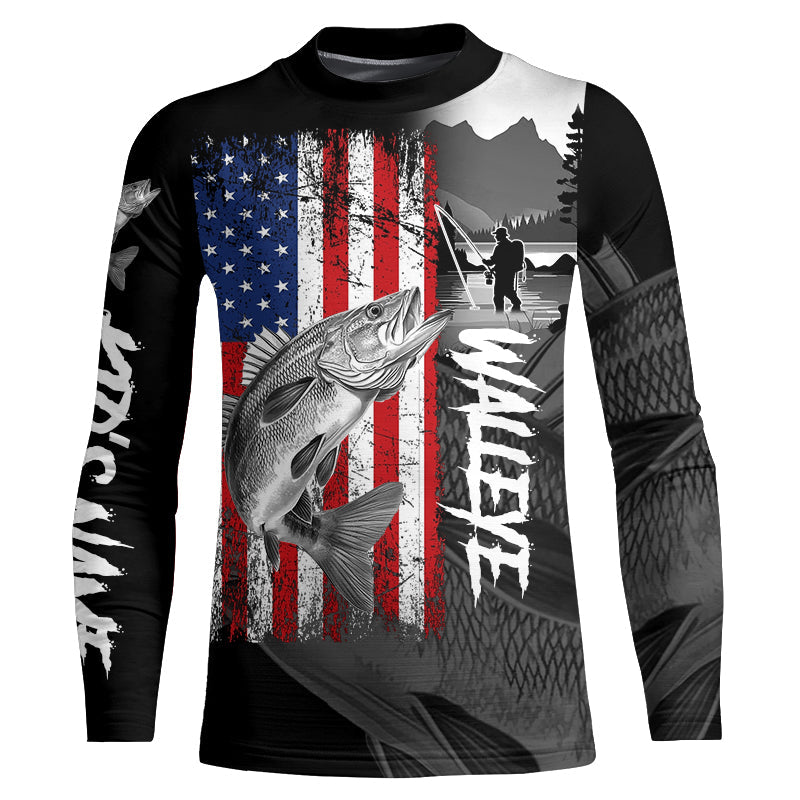 American Flag Walleye Fishing Custom long sleeve performance Fishing Shirts, Walleye fishing jerseys NQS8979