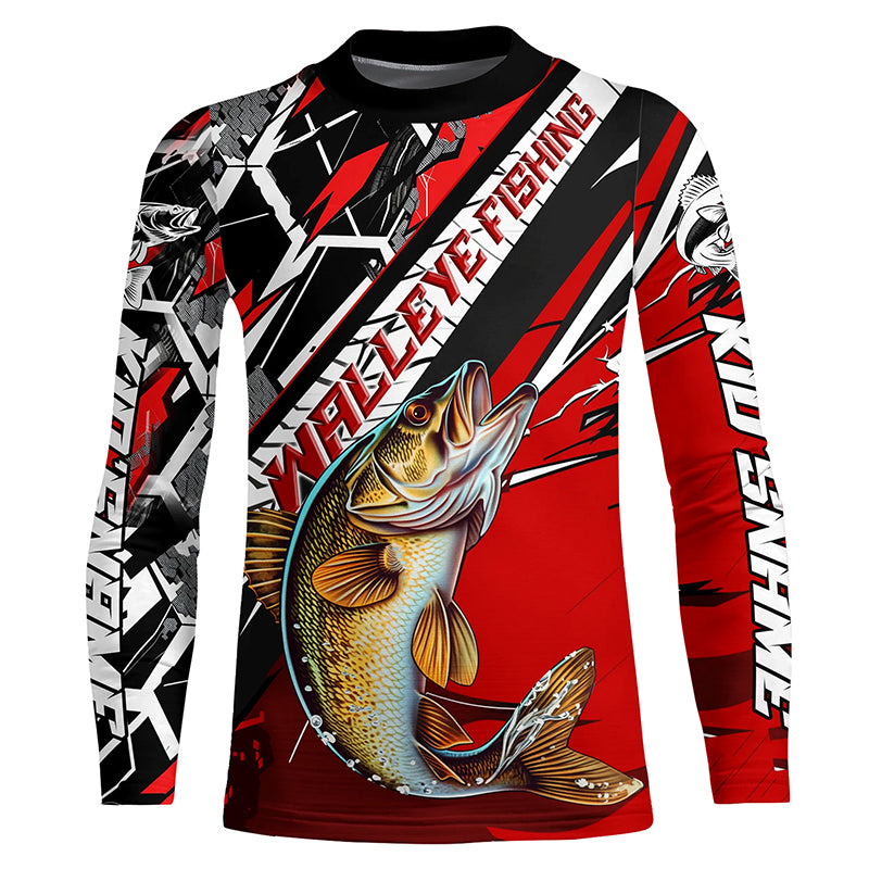 Black And Red Walleye Long Sleeve Tournament Fishing Shirts, Custom Walleye Fishing Jerseys IPHW6205