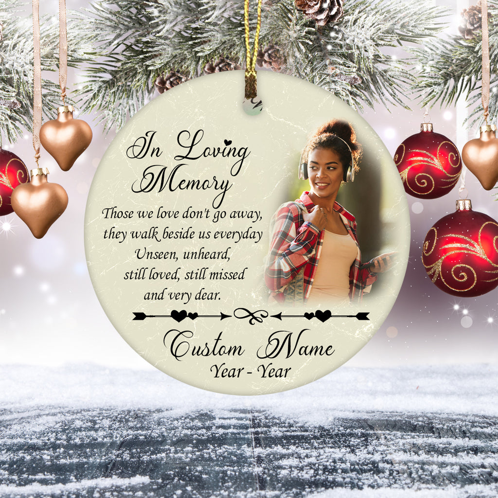 The memory Christmas ornament with meaningful words, personalized picture, name and dates is a heartfelt remembrance keepsake for the loved ones in heaven in holiday season.